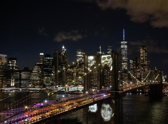 3月14日,新冠逝者的照片在纪念活动上被投射到美国纽约布鲁克林大桥上。新华社发(郭克摄)