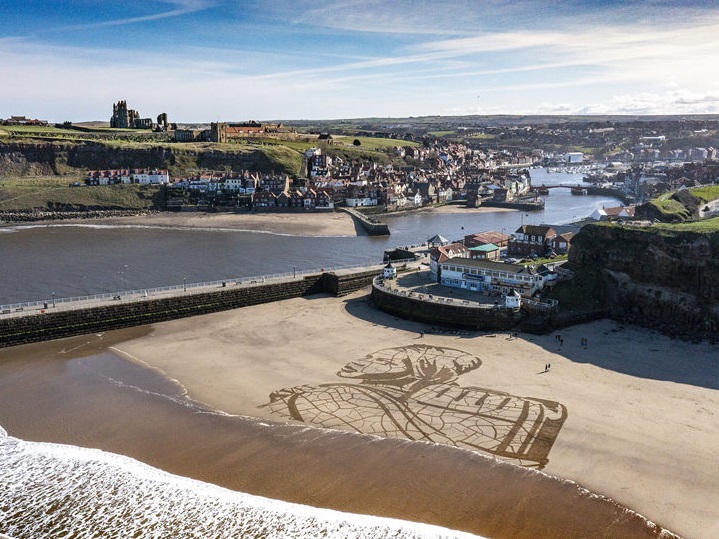人民网讯 当地时间3月15日,英国惠特比,在世界水日来临之前,水援助组织在惠特比海滩的沙滩上创作了一幅画,画中的孩子在涨潮的潮水旁提水,以强调气候变化对人们获取水的影响。