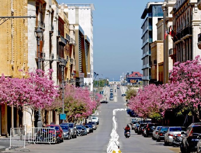 3月21日,一名女子在黎巴嫩贝鲁特街头拍摄盛开的春花。新华社发(比拉尔·贾维希摄)