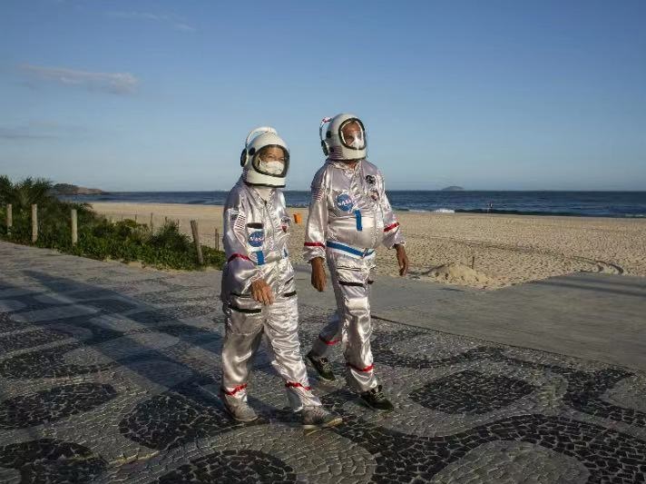 人民网讯 当地时间2021年3月20日,巴西里约热内卢,Tercio Galdino与妻子Alicea着太空服装扮出行伊帕尼玛海滩,在保护自己免受新冠感染的同时呼吁民众加强防疫。