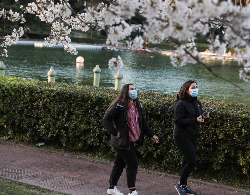 3月24日,佩戴口罩出行的市民从意大利首都罗马盛开的樱花树下走过。
