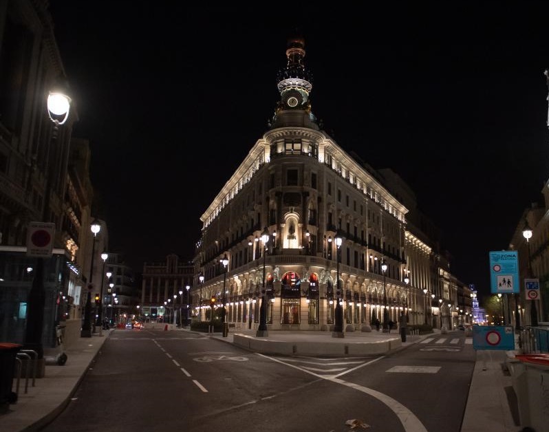这是3月27日晚拍摄的西班牙马德里空荡荡的街头。