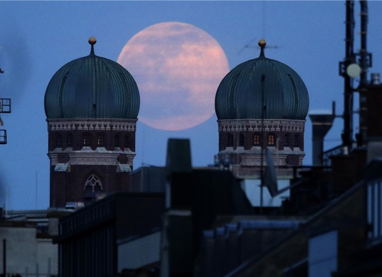 人民网讯 当地时间3月28日,德国慕尼黑,满月从圣母教堂后升起。