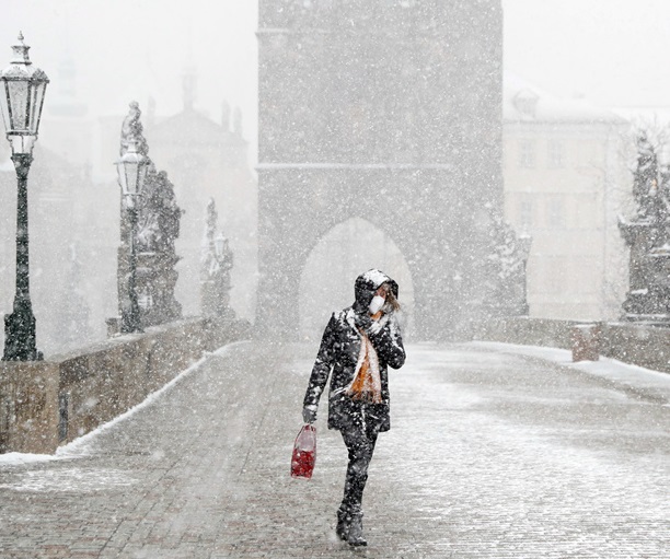 当地时间4月6日,捷克布拉格,民众冒着暴风雪,走过查理大桥。(图片来源:东方IC)