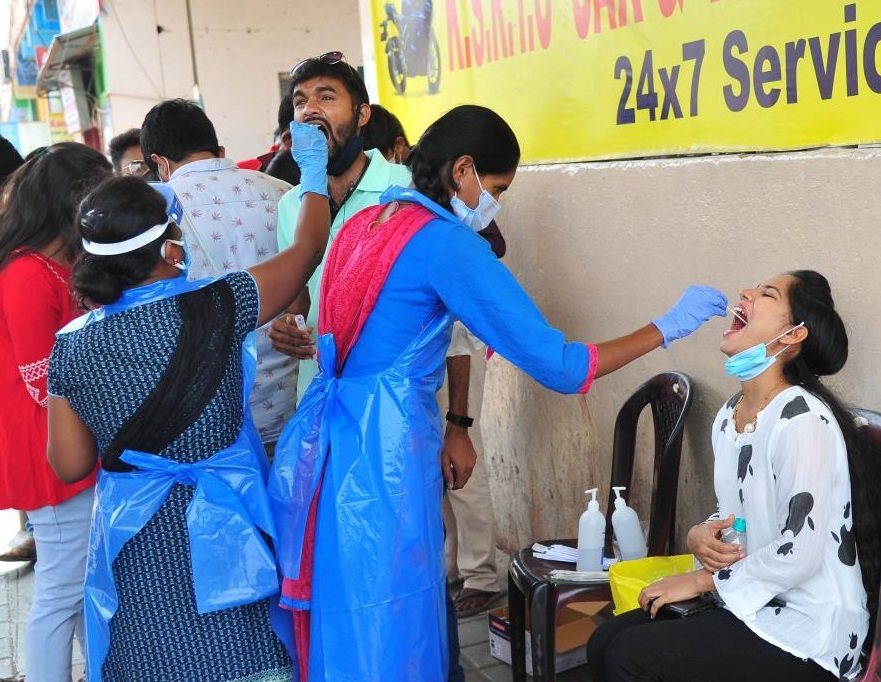 4月11日,人们在印度班加罗尔的一个公交站接受新冠病毒检测取样。
