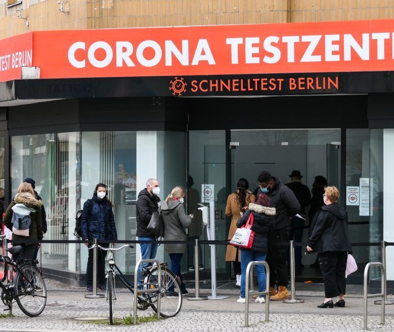 4月12日,在德国首都柏林,人们在一处新冠检测点外排队等候。