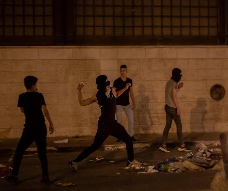 4月24日,一名巴勒斯坦示威者在约旦河西岸城市伯利恒向以色列士兵投掷石块。