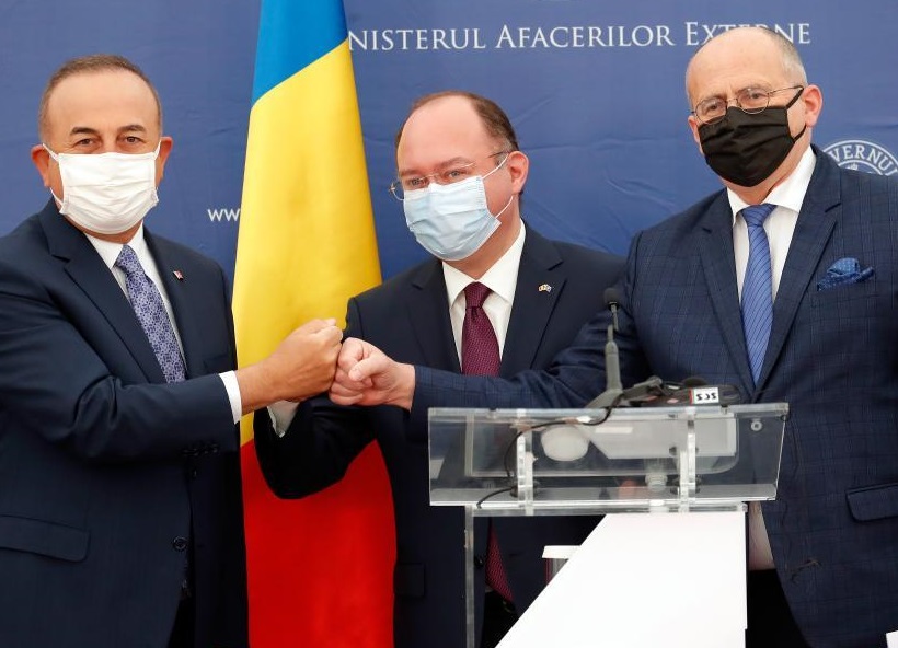 4月23日,在罗马尼亚首都布加勒斯特,罗马尼亚外长奥雷斯库(中)、波兰外长拉乌(右)和土耳其外长恰武什奥卢在联合记者会上碰拳。