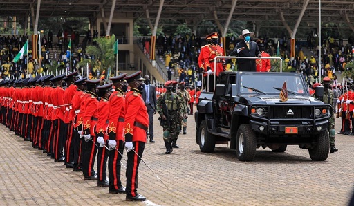 5月12日,穆塞韦尼(右前)在乌干达坎帕拉出席总统就职典礼时检阅仪仗队。