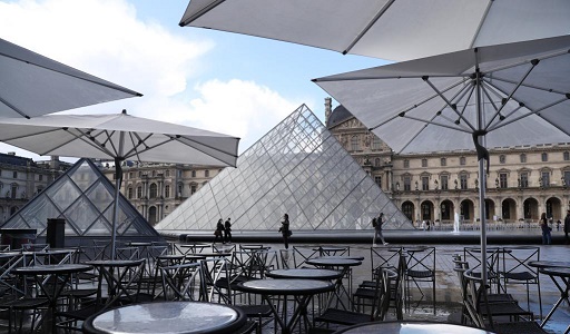 5月19日,法国巴黎卢浮宫博物馆旁的餐馆户外区域准备迎客。新华社记者高静摄