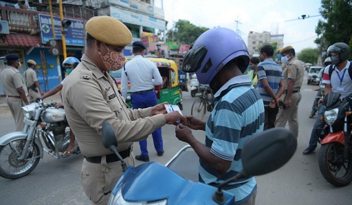 5月19日,警方人员在印度阿加尔塔拉街头查看路人证件。新华社发