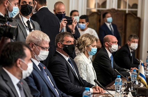 5月30日,以色列外交部长阿什克纳齐(前排左三)在埃及开罗与埃及外交部长舒凯里(不在画面中)举行会谈。新华社/法新