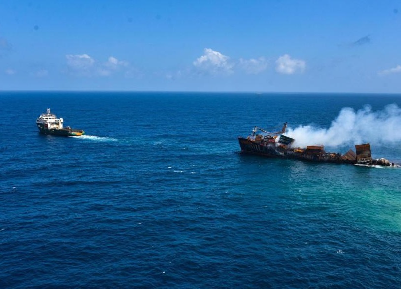 这是6月2日在斯里兰卡科伦坡港附近拍摄的逐渐下沉的起火货船“X-PRESS PEARL”号(右)。