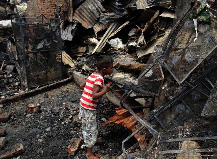 6月7日,一名儿童在孟加拉国首都达卡发生火灾的贫民窟废墟中寻找个人物品。
