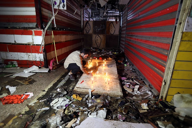 7月19日,在伊拉克首都巴格达东郊一市场,一名男子点燃蜡烛。