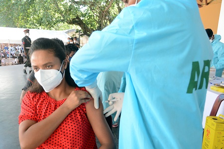 7月20日,一名女子在斯里兰卡科伦坡接种第一剂国药疫苗。