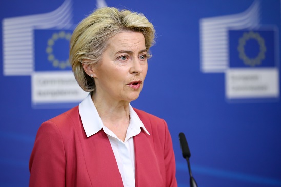 7月27日,在比利时布鲁塞尔,欧盟委员会主席冯德莱恩发表视频声明。