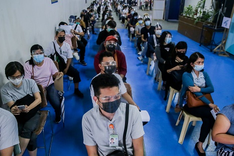7月27日,在菲律宾圣胡安,人们排队等待接种新冠疫苗。