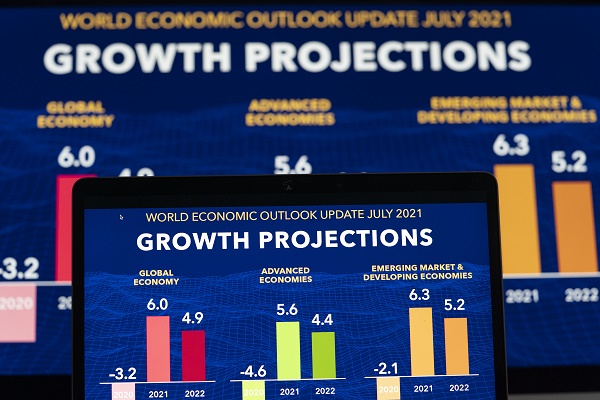 这是7月27日拍摄的国际货币基金组织(IMF)发布的《世界经济展望报告》中的2021年全球经济增长预期图表。