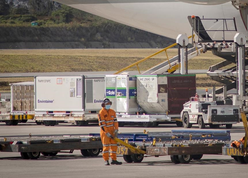 8月3日,工作人员在厄瓜多尔首都基多苏克雷国际机场转运新冠疫苗。