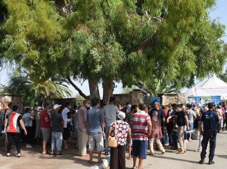 8月8日,人们在突尼斯首都突尼斯市一处新冠疫苗接种点排队等候接种疫苗。