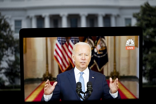 这张8月31日拍摄的屏幕显示的是美国总统拜登在华盛顿白宫发表讲话。