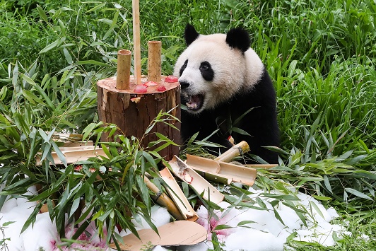 旅德大熊猫“梦梦”和“娇庆”的双胞胎幼崽“梦想”和“梦圆”31日迎来两周岁生日,柏林动物园为它们举办了庆祝活动。