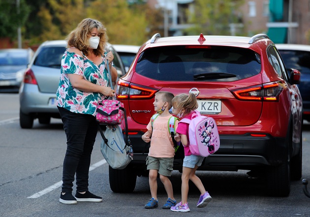 9月8日,一名家长在西班牙马德里送孩子上学。