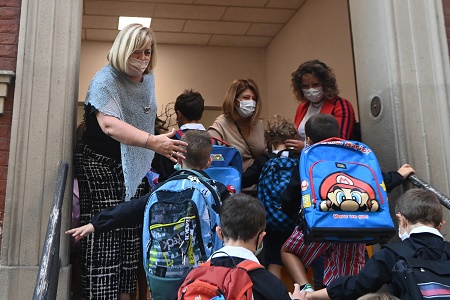 9月13日,学生在意大利博洛尼亚进入学校。9月13日后,意大利所有大区学校将陆续开学。根据意教育部公布的全国学校防疫措施,教职员工进入校园必须持有“绿码”。