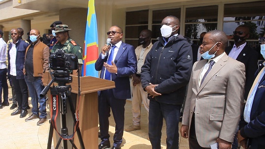 11月3日,刚果(金)南基伍省省长卡西(中)在该省首府布卡武市就当天凌晨发生的袭击召开新闻发布会。