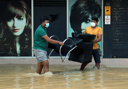 11月10日,在斯里兰卡尼甘布,人们在积水中搬运家具。