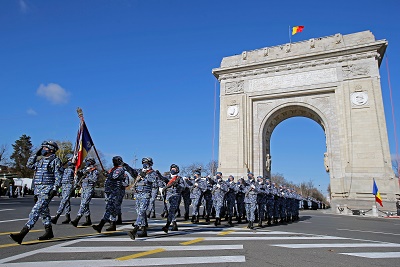 12月1日,士兵在罗马尼亚首都布加勒斯特凯旋门参加阅兵式。