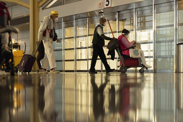 12月4日,在美国弗吉尼亚州阿灵顿的罗纳德·里根华盛顿国家机场,戴口罩的旅客走在航站楼内。