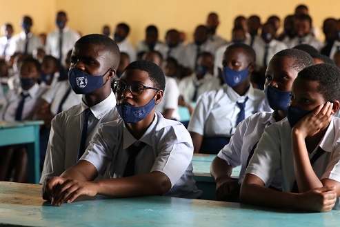 2月4日,在卢旺达首都基加利的一所学校里,学生们收看北京冬奥会开幕式直播。