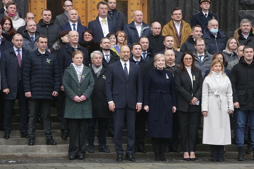 2月16日,在乌克兰首都基辅,乌克兰内阁成员在乌政府办公大楼前参加团结日庆祝活动。