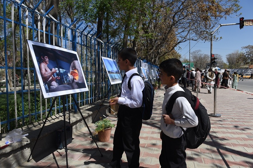 3月31日,阿富汗民众在首都喀布尔街头观看名为“贫困与希望”的摄影展。