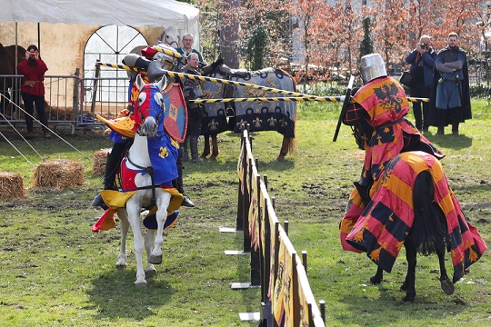 4月10日,身着古装的骑手在比利时小城乌费的中世纪风情节上为观众表演。
