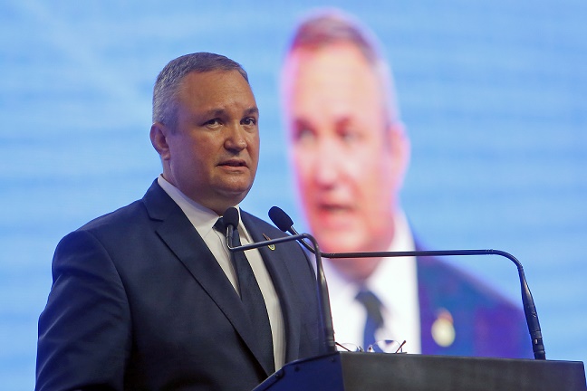 4月10日,在罗马尼亚首都布加勒斯特,罗马尼亚总理丘克在国家自由党特别代表大会上发表讲话。