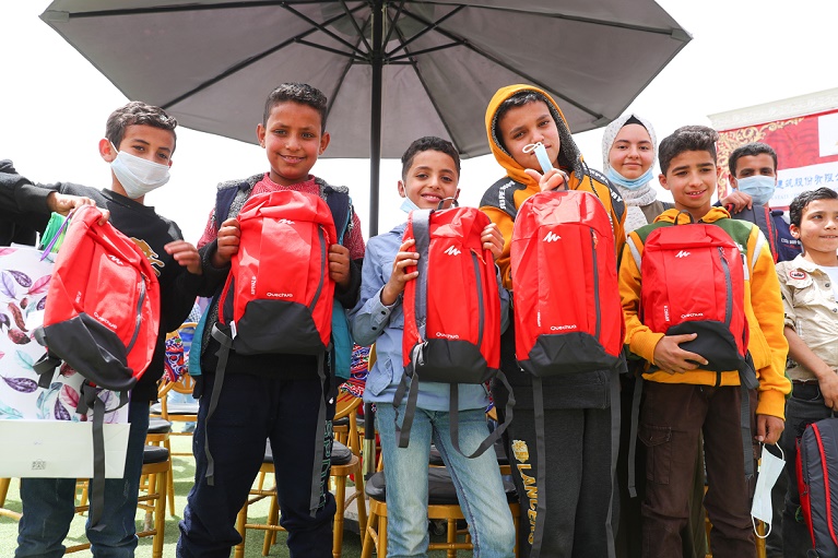 4月16日,在埃及开罗,孩子们在斋月慈善活动上展示收到的书包。