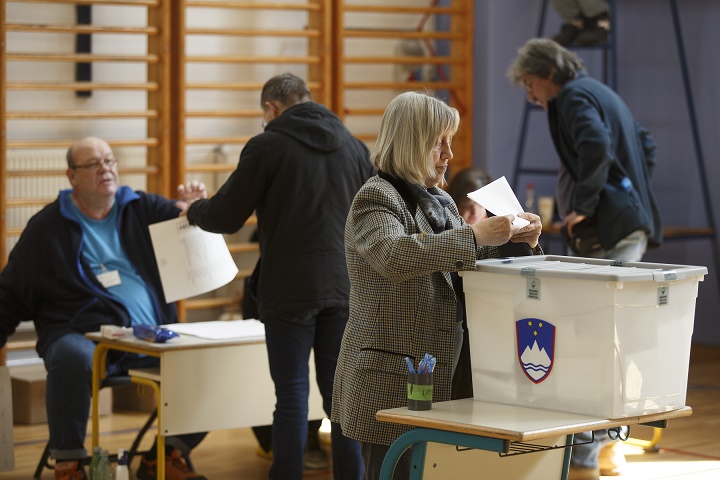 4月24日,在斯洛文尼亚首都卢布尔雅那的一处投票点,选民参加议会选举投票。