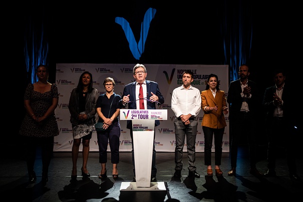 6月19日,法国极左翼政党“不屈法国”领导人梅朗雄在巴黎举行的选后集会上讲话。