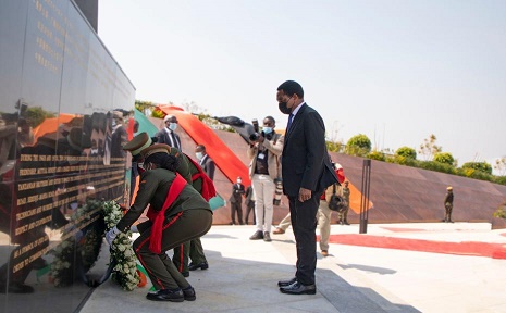 8月10日,在赞比亚卢萨卡省琼圭地区的坦赞铁路纪念园,赞比亚总统希奇莱马(前右)向为修建坦赞铁路等项目而牺牲的中方人员敬献花圈。新华社发(中国土木工程集团供图)
