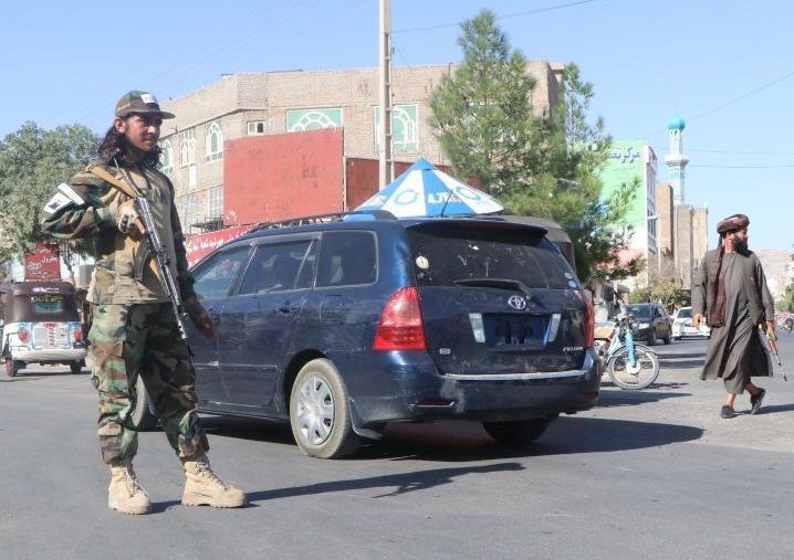 9月2日,在阿富汗赫拉特省发生爆炸的清真寺附近,安全人员设卡检查。