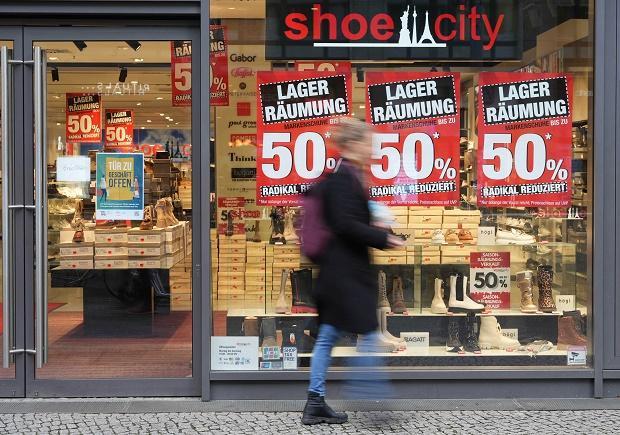 1日,一名女子经过德国柏林的一家打折店铺。新华社发(斯特凡·蔡茨摄)