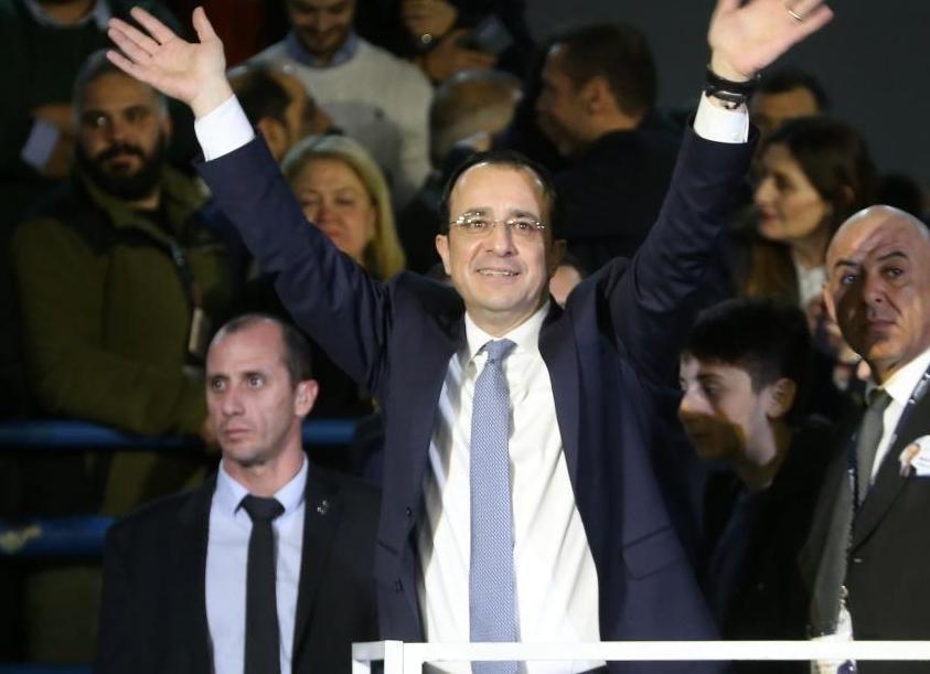 图为2月12日,在塞浦路斯首都尼科西亚,当选总统赫里斯托祖利季斯向支持者挥手致意。新华社发(乔治·克里斯托弗鲁摄)
