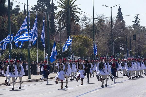 图为3月25日,希腊总统卫队参加在雅典举行的独立日阅兵仪式。
