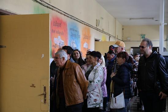 图为2日,保加利亚民众在索非亚一处投票站等待投票。新华社记者 林浩 摄