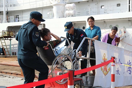 中国海军“和平方舟”号医院船访问东帝汶并开展医疗服务期间,医院船官兵为当地行动不便的患者服务(9月6日摄)。新华社发(桂江波 摄)
