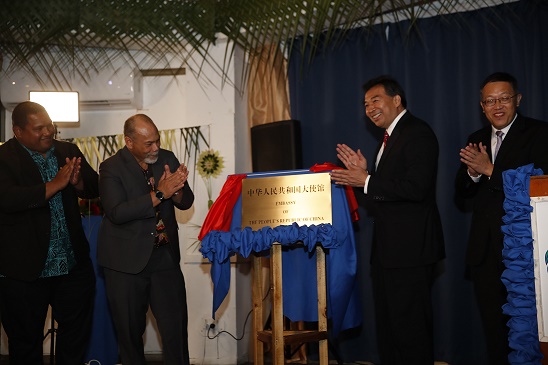 图为29日,中国政府代表、国家国际发展合作署署长罗照辉和瑙鲁外长安格明共同为使馆揭牌。 新华社发(陈国龙 摄)