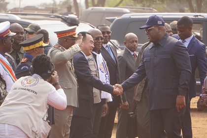 6月22日,在刚果(金)首都金沙萨,刚果(金)总统齐塞克迪(前右)在开工仪式上与中方企业代表握手。新华社记者 史彧 摄